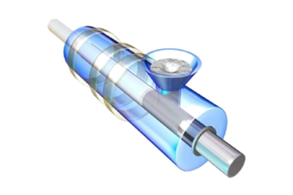 Figure 1. The ram extruded polyethylene process draws resin into a cylindrical heated chamber and compresses the mass under high temperature and pressure. |