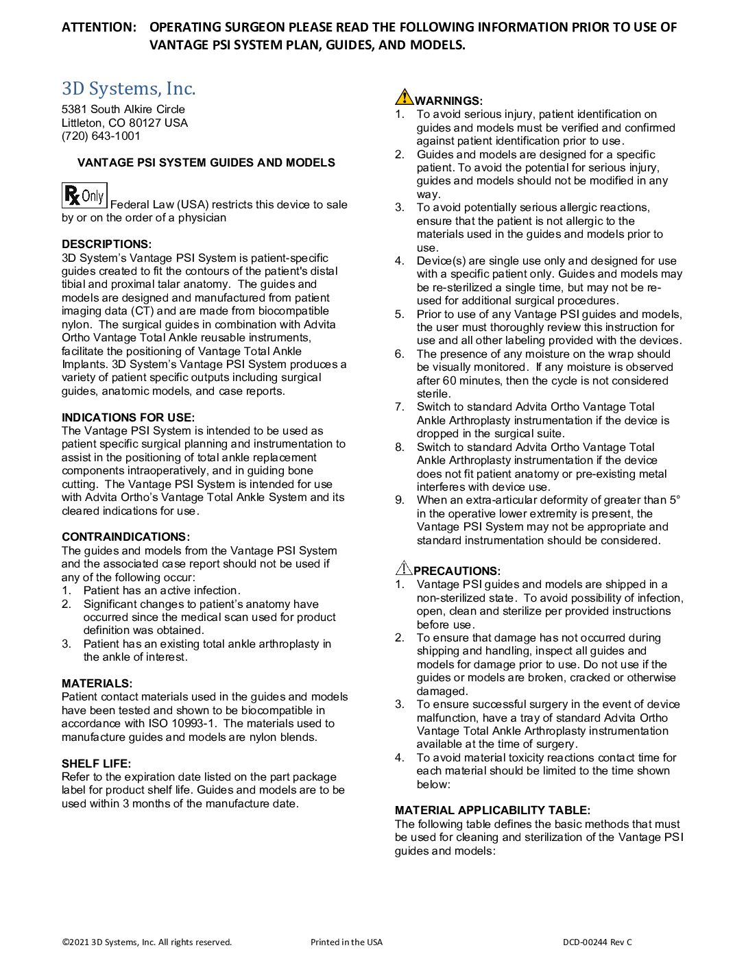 Vantage Ankle PSI System Guides & Models Sterilization